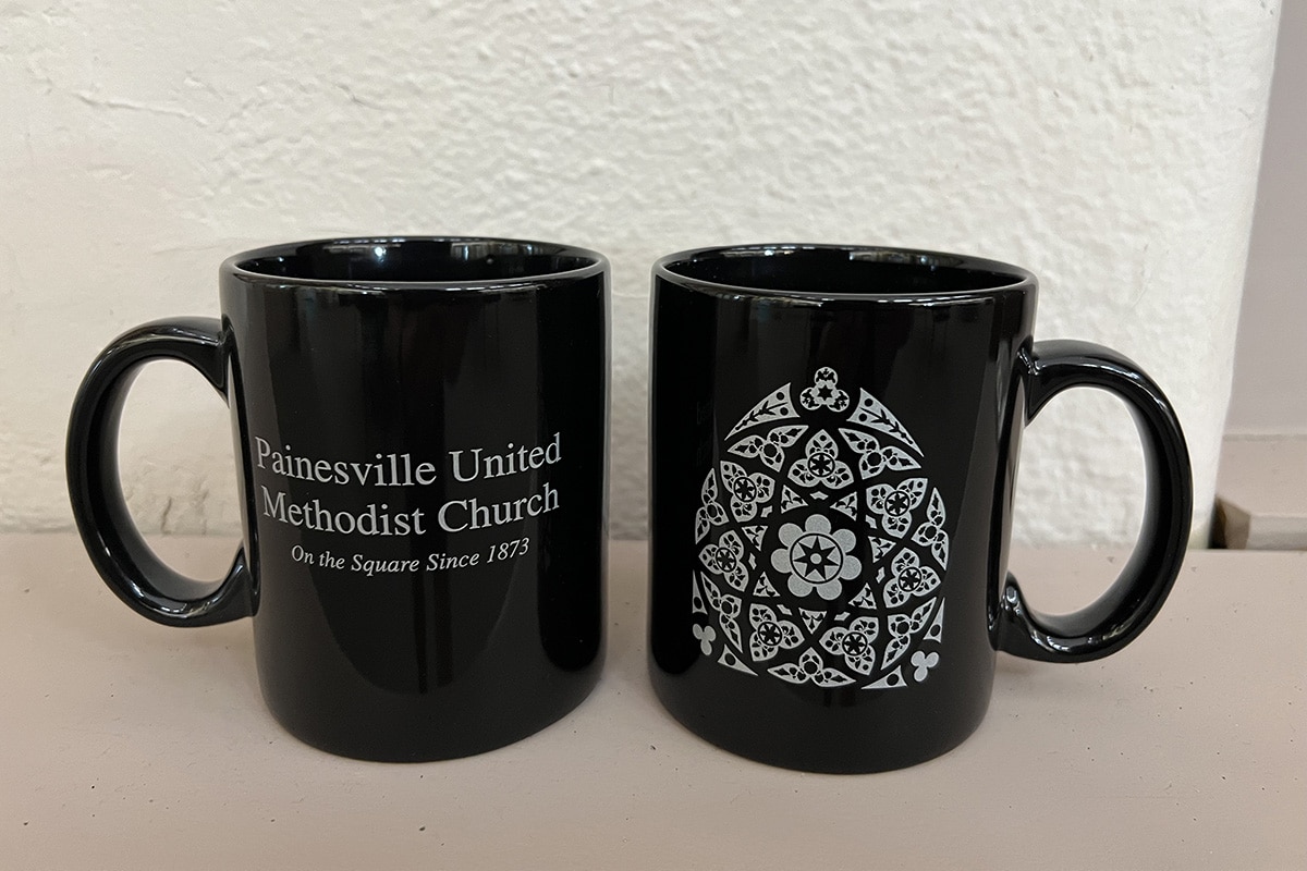 In 2023, the Painesville United Methodist Church celebrated its 150th anniversary of our address on the Square! In celebration, we are offering Sesquicentennial mugs featuring our historic Rose Window design for just $10 each. These mugs have a black base and silver imprinted design, also featuring the following text: “Painesville United Methodist Church on the Square since 1873”. Purchases for mugs must be made locally; mugs are not shipped. Checks or cash can be brought to the church office during business hours or on most Sundays after worship services. Checks should be made out to the Painesville United Methodist Church and state “mugs” in the subject line. These mugs are dishwasher safe, however, due to the metallic print, these mugs are not safe for microwave use. Questions? Contact Maria in the church office for more information.