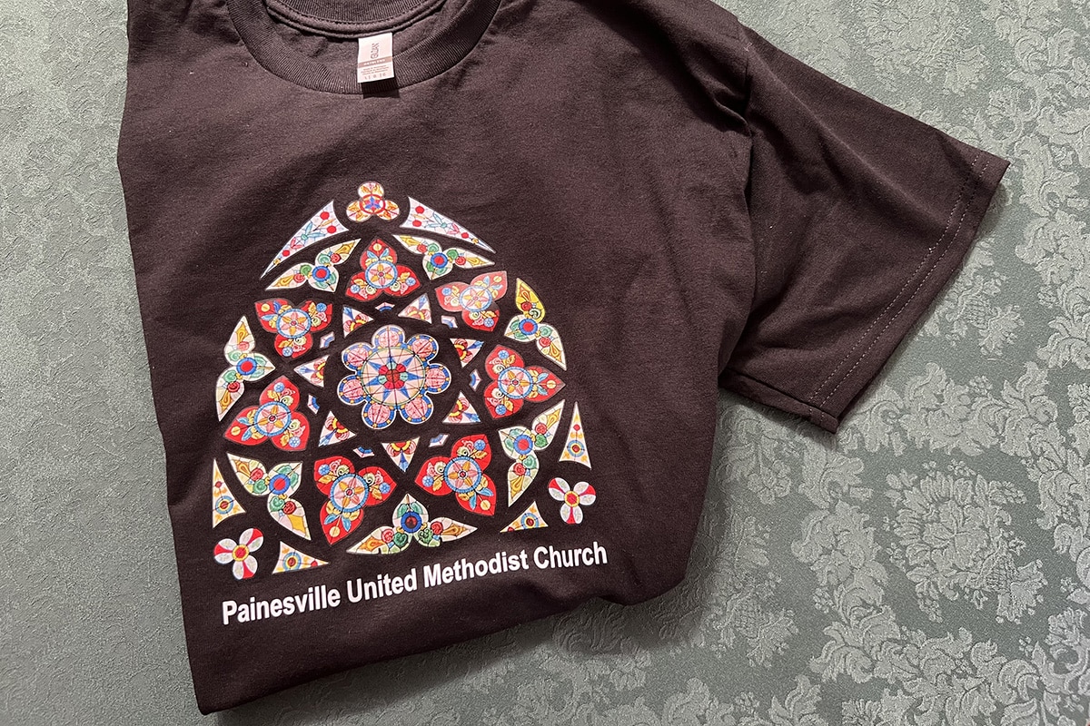 In 2022, PUMC updated their church shirt to a black cotton tee featuring a Rose Window design on the front with the words “Painesville United Methodist Church”. Typically, ordering is opened up for a few weeks at a time to place a group order in the Spring; limited inventory is kept on hand. If you are interested in ordering a Rose Window t-shirt please contact Maria in the church office.