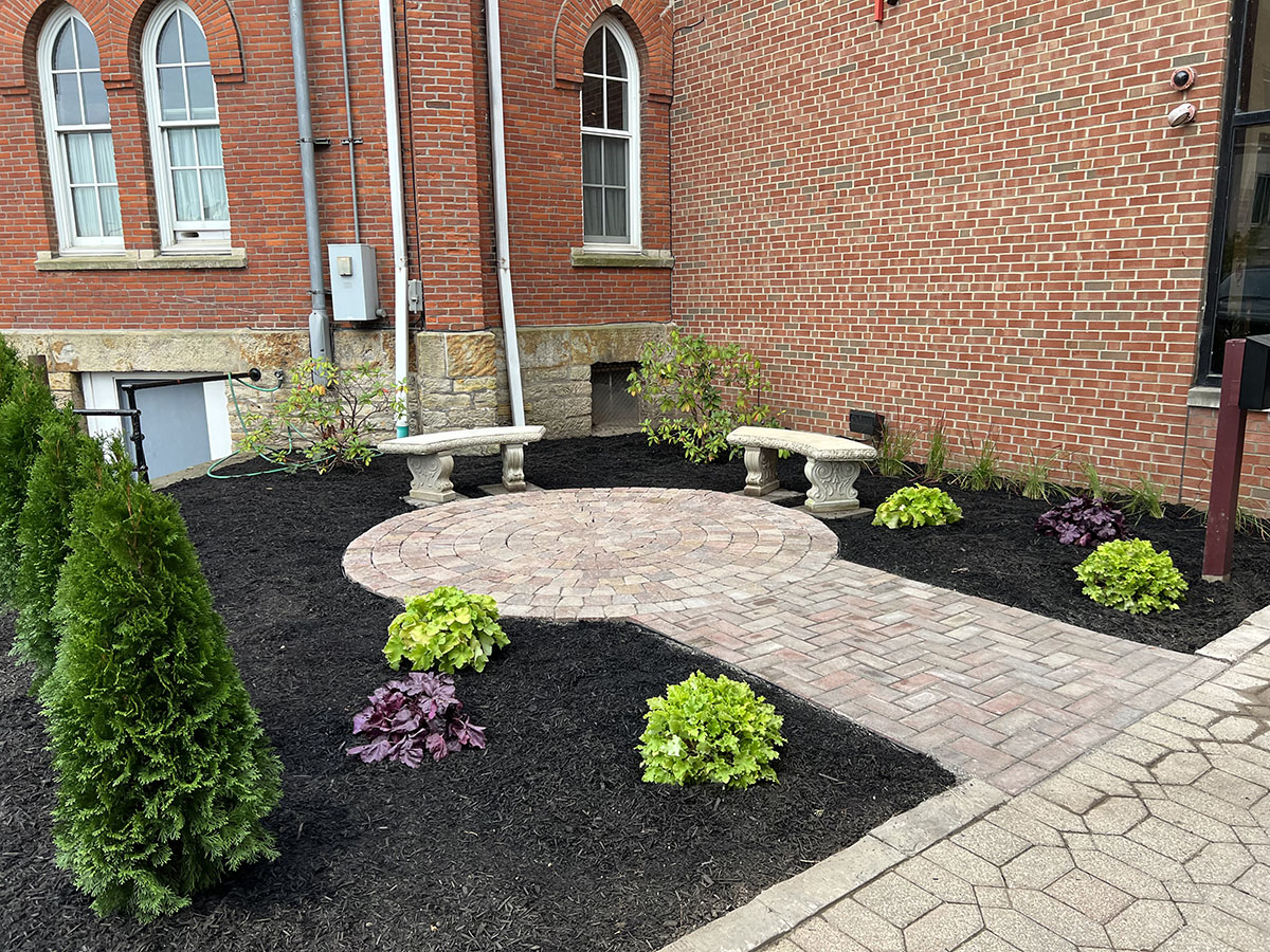 Outside of our glass atrium entrance we have a lovely prayer garden for folks to pause, sit, and take a few moments to commune with God.  This space is actually an Eagle Scout project completed by Trevor Sprow from Boy Scout Troop 64 in October 2023.  Trevor has given many hours of his time as a volunteer at Painesville United Methodist Church, so when it was time to think about his Eagle project it was a natural extension to offer his time and service toward a meaningful legacy here as well.  He worked closely with the PUMC Board of Trustees to plan appropriately for the space and then brought in fellow scouts and adult leaders from the Troop to bring the vision to life.  Now, we have a beautiful, mindfully-designed space to allow for peace and prayer in the midst of busy downtown Painesville!