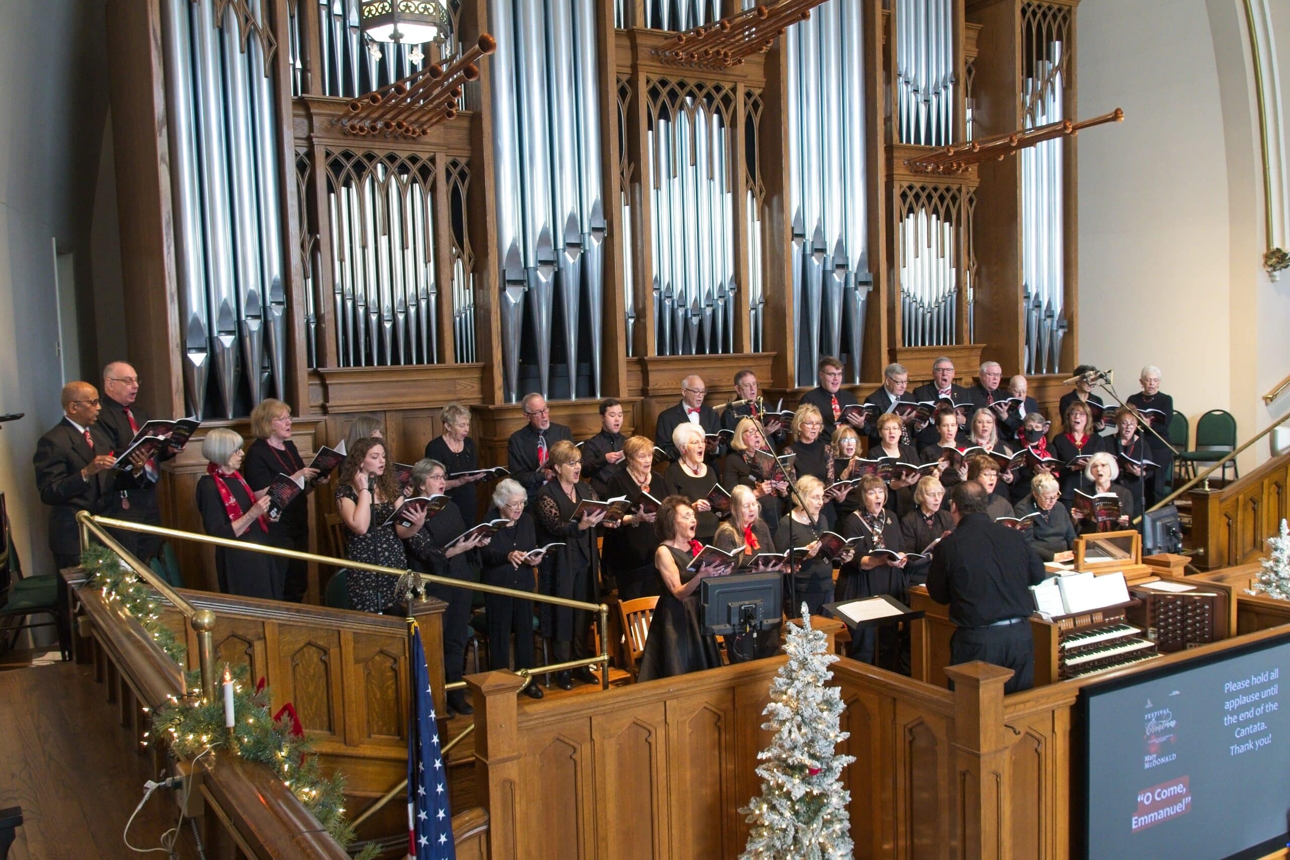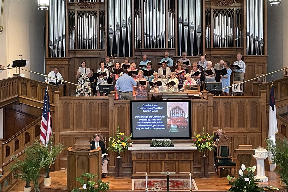 Our Chancel Choir includes vocalists with ranges of 1st and 2nd soprano, alto, tenor, baritone, and bass.  The Chancel Choir is composed of volunteers who love to sing and are generally available to practice on most Thursday evenings and typically perform on Sundays during our 10am worship service throughout the academic year.  While our Chancel Choir is not usually lined up for performances during the summer months, there are special holidays and events that come up throughout the year wherein the Choir or choral members may be asked to lend their voice.   Newcomers interested in joining may contact the church office for practice times and locations!  Conducted by Fritz Streiff and accompanied by Jerry Marshall.